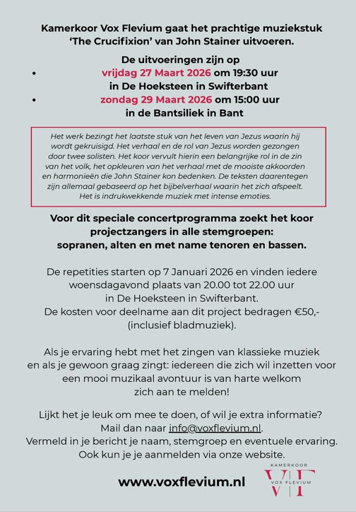Kamerkoor Vox Flevium organiseert op woensdagavond 10 december ‘25